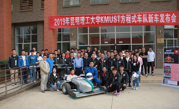 KMUST方程式车队在工程训练中心综合楼门口举行2019年新车发布会,教务处、交通学院、工程训练中心相关负责人、指导教师、车队成员等80余人到现场观摩。