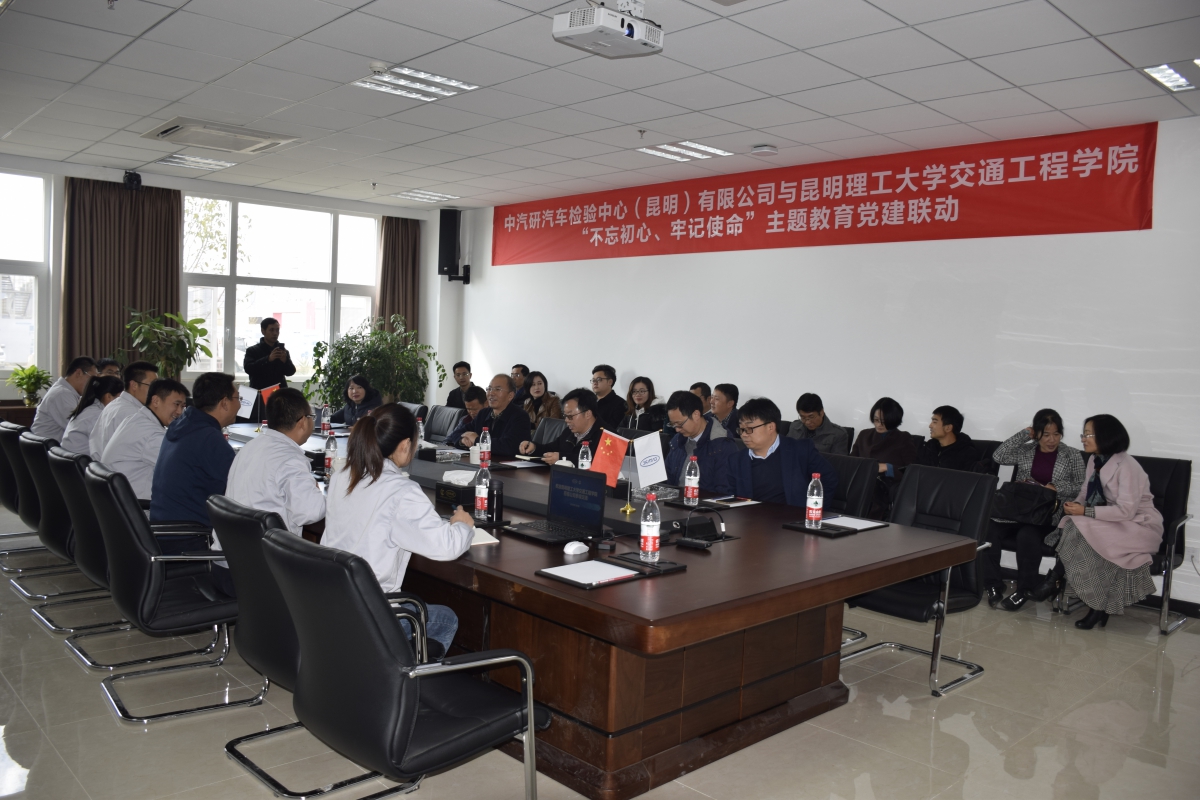 党政班子、教授、博导、科室、系负责人、党支部书记一行30余人到访中汽研(昆明)汽车检验中心有限公司,与中汽研汽车检验中心(昆明)有限公司党支部开展“校企党建联动、质量提升、共谋发展暨“不忘初心、牢记使命”主题教育推进交流会”,进行党建业务联建活动。中汽研汽车检验中心(昆明)公司副总经理赵万春,党支部书记葛宇,管理部、整车部、排放部相关负责人的热情接待。