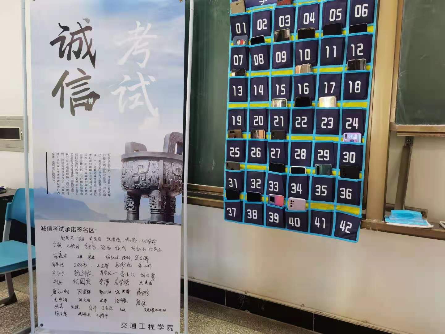 在无人监考考场中,讲台一侧立有带所有考生签名的《诚信考试承诺书》,同时讲台上还设有手机袋方便同学们考试前放置手机。考试过程井然有序,同学们按照《91热爆