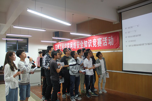 在主持人介绍完评委嘉宾之后,一个网络安全视频拉开了竞赛的帷幕。此次竞赛共三个环节,首先是入门必答题,题目以PPT的形式给出,主持人念完题目后,参赛队员举牌参与答题。其次是风暴抢答题,题目同样以PPT的形式给出,每道题后附着不同的电话号码,主持人宣布“开始”后,参赛队员拨打对应号码进行抢答,率先拨通电话的队伍获得答题权并进行答题。最后是奇妙主观题,各队负责人通过抽签形式选取题号,每个队伍各一题各参赛代表按题号依次答题。舞台上,参赛者英姿飒爽,观点明确,角度新颖对各个问题做出了完美的解答。教室里,聆听者聚精会神,评委兴致勃勃,认真倾听。每一个组的演讲都会赢得观众热烈的掌声,随着大屏幕上的PPT内容不断变化,一个个关于网络安全的问题被提上来。参赛者解答的风格各不相同,不同的问题使教室里的气氛随之变化,其中的一些网络安全问题让大家都陷入了深思。参赛选手竭尽全力展示自己的演讲,在各位同学热情的参与下,活动逐渐接近尾声。在计分组统分的过程中,主持人邀请了第五小组的选手发表了活动感言,紧接着评委嘉宾对获奖的三个小组颁发了奖状。最后由学生会主席王天宇总结,至此竞赛圆满结束。