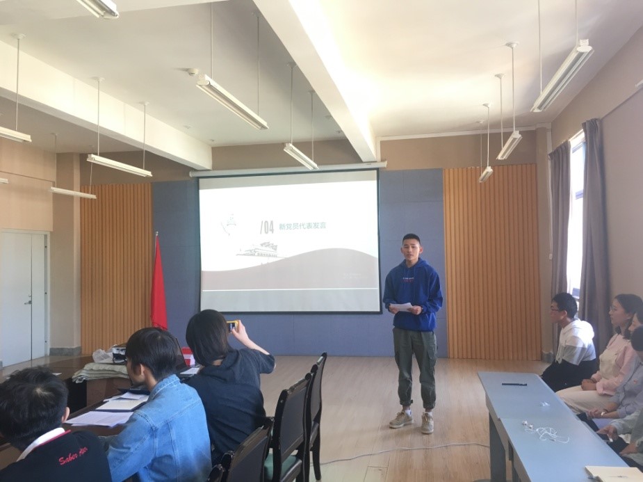 仪式进行到第三项,王懿娜老师带领43名新发展预备党员面对党旗进行入党宣誓。宣誓仪式过后,预备党员代表王申义同志发言,他表示:通过党的培养自己的能力得到了提升,在以后的学习生活中会继续以一名共产党员的标准严格要求自己,更加努力,学好理论知识,提高个人素质,更好地服务社会,起到党员先锋模范带头作用。